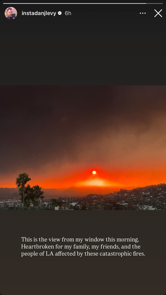 The Schitt’s Creek star posted an eerie photo to his Instagram Story Jan. 8 of the wildfire’s smoke blocking the sun, writing, “This is the view from my window this morning. Heartbroken for my family, my friends, and the people of LA affected by these catastrophic fires.”